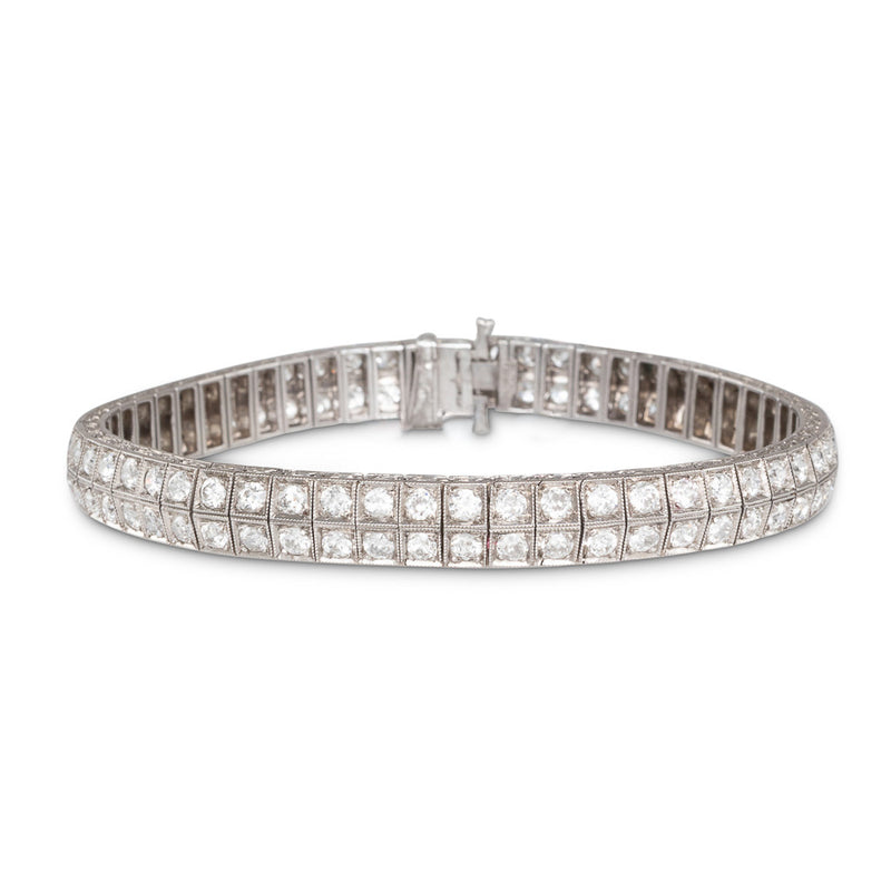 14ct white gold line bracelet set with pairs of old/early modern brilliant cut diamonds in mill grained box settings, articulated and engraved to both sides, fastening with a concealed clasp with engraved safety catch.