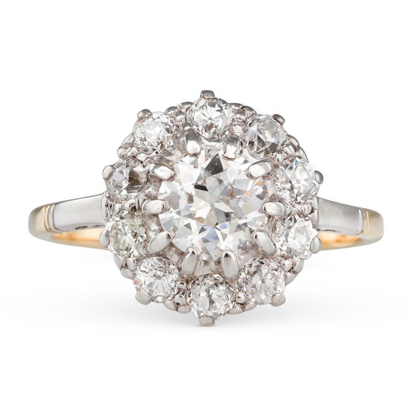 18ct yellow and white gold cluster ring set to the centre with a transition cut diamond of estimated weight 0.60ct graded as colour H-I, clarity VS, surround by ten old cut diamonds to upswept cheniered shoulders and a polished yellow gold band.