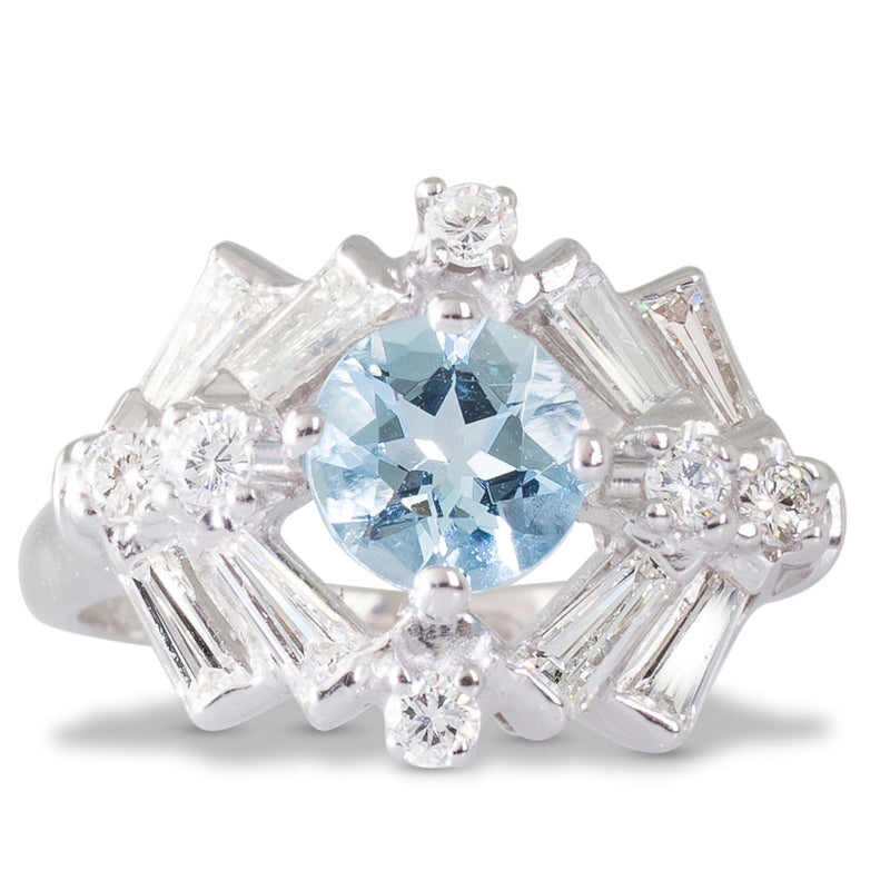 14ct white gold ring four claw set to the centre with a round aquamarine weighing 0.70ct above a geometric surround set with eight tapered baguette cut and six round brilliant cut diamonds to upswept shoulders and a plain polished band.