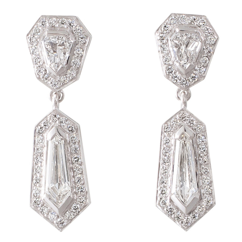 18ct white gold diamond drop earrings in an Art Deco style each with a spear point diamond drop in a grain set surround of twenty four millegrain set diamonds suspended below a shield shaped diamond top again surrounded by small brilliant cut diamonds and fitted with posts and butterflies.