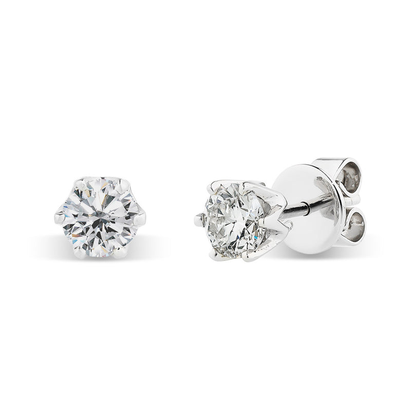 Pair of 18ct white gold stud earrings, each six claw set with a transition cut diamond, in a zig zag style setting, with posts and disc style butterflies.