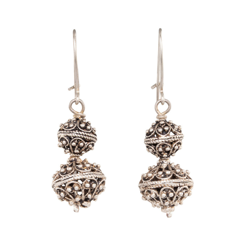 Silver pair of drop earrings, each with two filigree and bead decorated balls, from clip in silver hooks.
