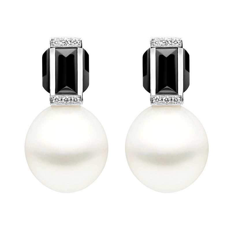 A pair of semi-round white Kailis Australian South Sea pearl and onyx Sugarloaf By Night stud earrings in 18ct white gold. The Brand 1 pearls measure 12mm and have a bright lustre and very few natural surface marks. The facetted onyx is flanked by diamonds and white gold.