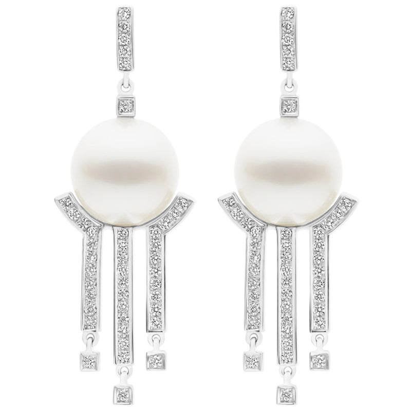 Kailis 18ct white gold 'Metropolis' earrings, featuring two 11-12mm round Australian south sea pearls, Brand 1. Pave set with 0.56cts (G/VS) round brilliant cut diamonds.