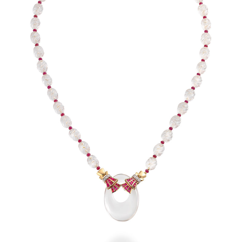 A strand of carved rock crystal beads alternating with small ruby beads, to the centre of the necklace is an elongated oval cabochon of rock crystal with an open centre, attached to each side is a stepped, fan shaped gold fitting channel set with calibre cut rubies and grain set with old cut diamonds, the necklace fastening with a rectangular gold ruby set clasp and figure eight catch. The gold tests as 14ct and 18ct.