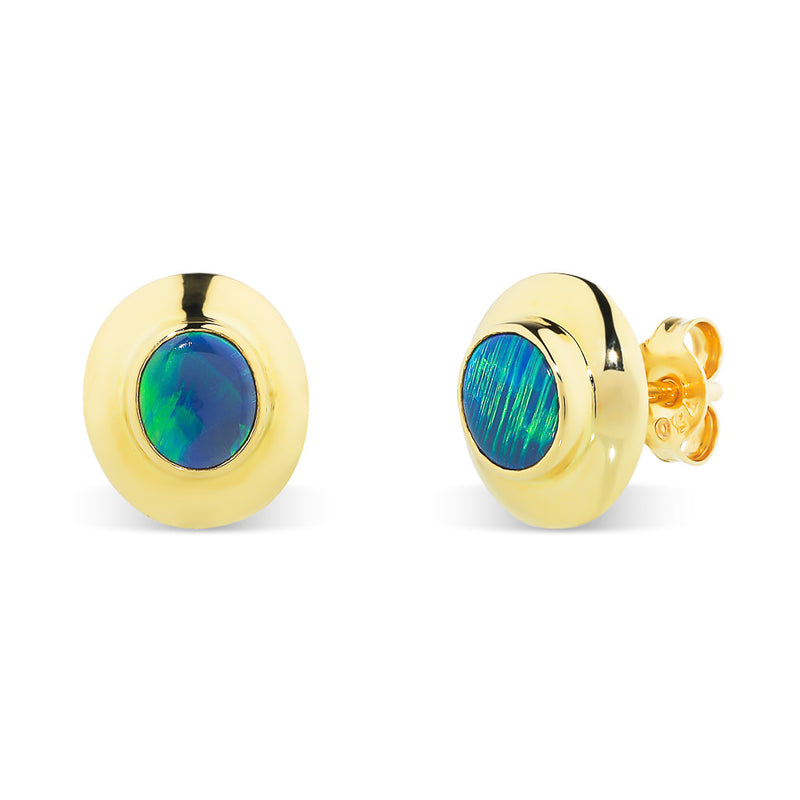 18ct yellow gold stud earrings bezel set with an oval cabochon solid black opal, surrounded by a border of highly polished gold, with posts and butterflies.