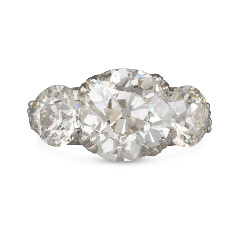 Antique platinum three stone filigree ring claw set to the centre with a GIA certified 4.04ct old European cut diamond graded as colour K, clarity SI1 and to either side a GIA certified old European cut diamond, 1.09ct and 1.08ct, graded as colours L and K and clarities SI1 and SI2 respectively on an elaborately engraved band.
