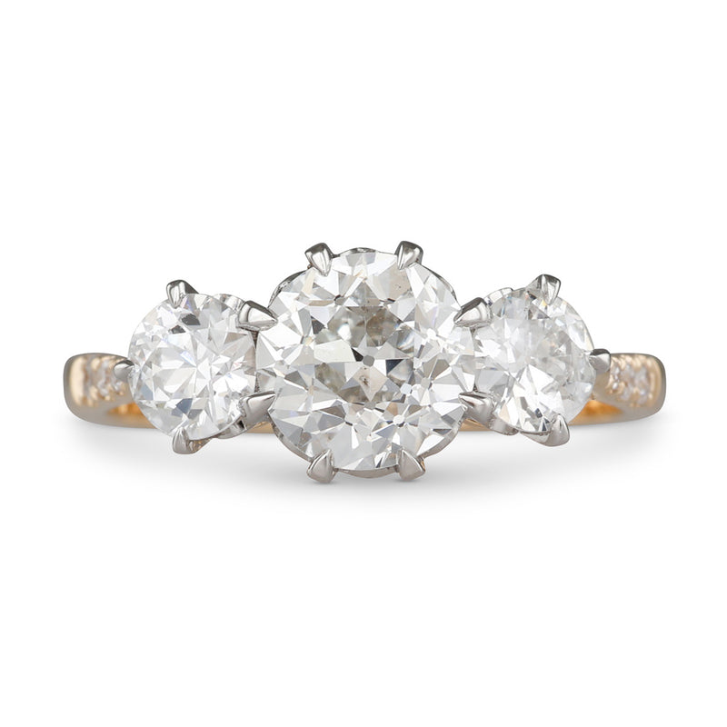 18ct yellow gold and platinum ring claw set to the centre with a GIA certified 1.19ct old European cut diamond graded as colour H, clarity SI1, and to either side a smaller old European cut, all in arched platinum settings on a yellow gold underrail to upswept open shoulders, each set with three small diamonds, on a plain polished band.