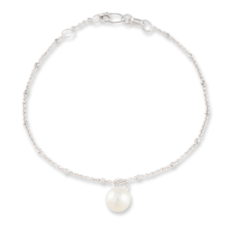 A round pink-white Australian Akoya pearl measuring 6.5mm with a bright lustre and a few natural surface marks on a 9ct white gold cable square ball bracelet.