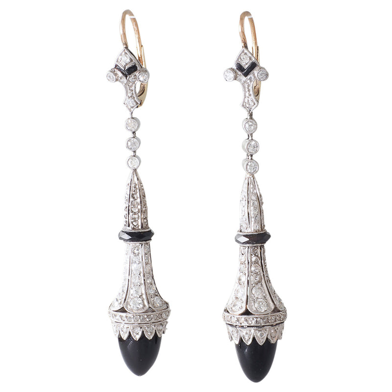 A pair of platinum antique earrings, on two tone gold European clip fittings, each top set with small diamonds and articulating to a line of bezel set diamonds which connect to the elongated drops, which are fully diamond set and feature polished onyx to the base and a band of onyx around the pierced and diamond set section.