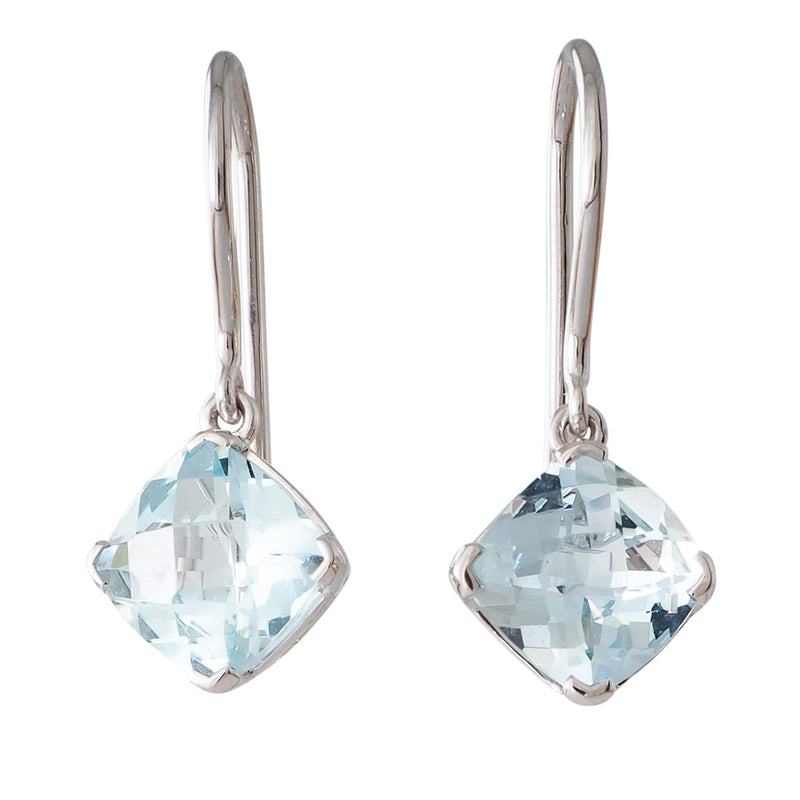 18ct white gold pair of drop earrings each with a cushion cut aquamarine set in corner claws on a double railed galery articulated below polished shepherd's hooks.