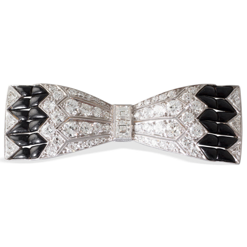 Platinum Art Deco mill grain edged undulating bow brooch with two asscher cut diamonds to the centre four rows of graduated round diamonds extending out to either side each with a zig zag of round diamonds followed by custom cut cabochon onyx both sides finishing with three trilliant cut diamonds the brooch fastens to the reverse with a 14ct yellow gold hinged pin and a roller catch.