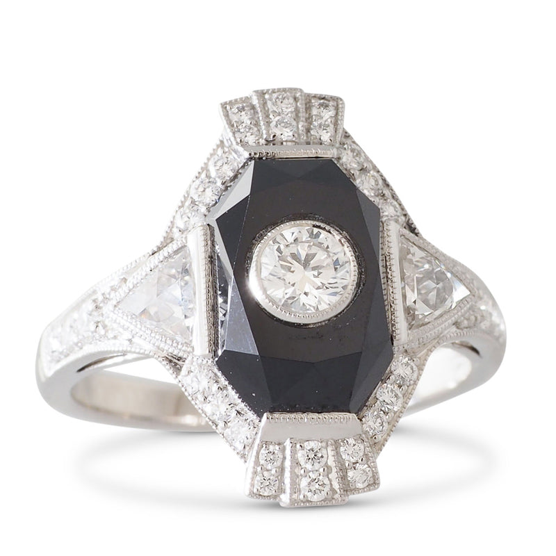 Platinum elongated plaque ring set with a round brilliant cut diamond weighing 0.20ct and surrounded by onyx with a rose cut diamond to each shoulder and round brilliant cut diamonds in a fan shape and to the shoulders on a plain polished band.