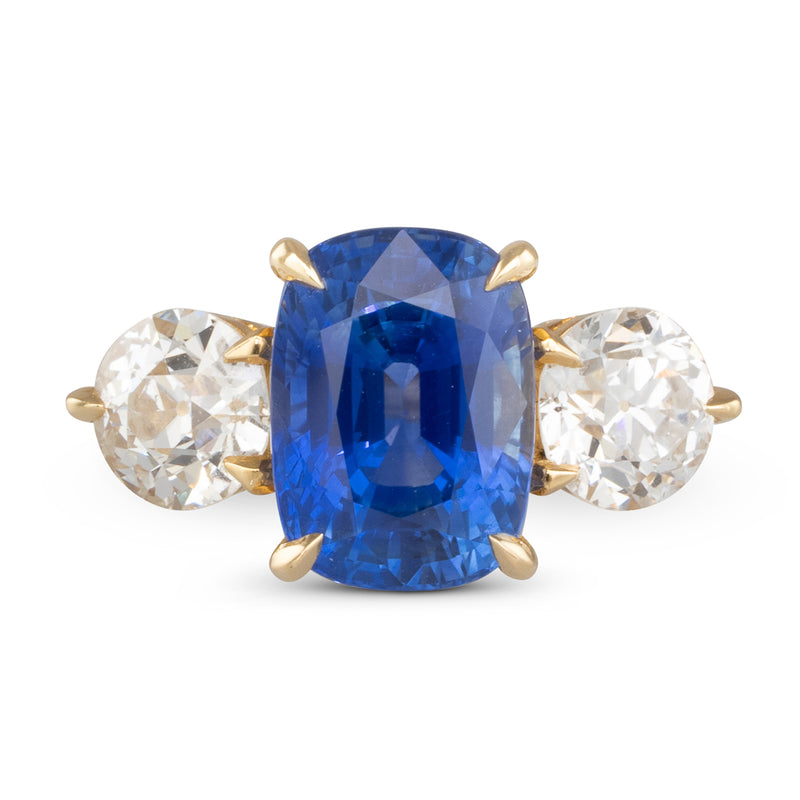 18ct yellow gold ring, set to the centre in four tapered claws with a GIA certified 4.76ct cushion cut Sri Lankan sapphire and to either side a GIA certified old European cut diamond, in three claws, all on a railed and pierced gallery, to upswept open shoulders and a plain polished band.