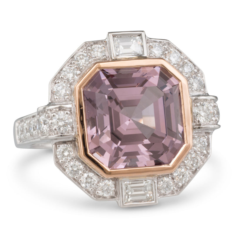 18ct white gold cluster ring, bezel set to the centre, in rose gold, with a GIA certified unheated octagonal purple-pink spinel, weighing 4.62ct, to the surround a baguette cut diamond above and below with round brilliant cut diamonds to the rest of the border and to the shoulders, on a polished band.