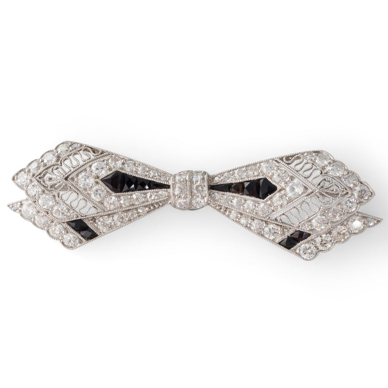 Platinum bow brooch, grain set to the centre with single cut diamonds, channel set in kite shaped settings, and to two outer edges with calibre cut black onyx, grain set to the bow with a mix of old cut and single cut diamonds, with filigree detail and mill grain edging, the brooch fastening with a hinged pin and rioller catch.