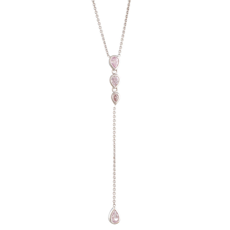 18ct white gold necklet bezel set with four pear cut pink diamonds, the largest, suspended from a length of chain, weighing 0.17ct and GIA certifed as fancy pink-purple in colour, the top three diamond descending in size, all in articulated bezel settings, fitted to a fine trace link chain, adjustable in length and fastening with a parrot clasp.