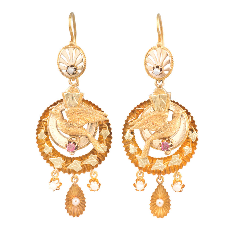 18ct multicoloured gold pair of drop earrings, each with a bird in flight to the central round articulated panel and a claw set pink paste, surrounded by a larger circle with leaf decoration, three seed pearls below, the central in a gold shell, all from a shepherd's hook with a pierced oval panel and seed pearl to the front.