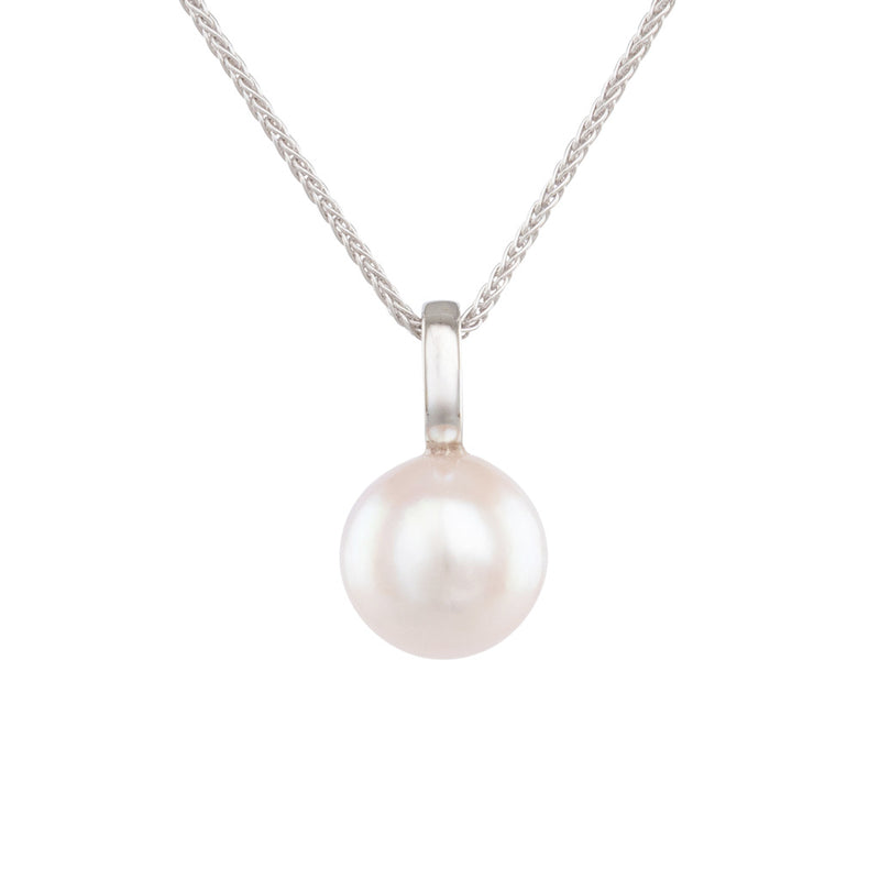 A round white/pink Japanese Akoya pearl pendant in 18ct white gold featuring a pearl measuring 8 - 8.5mm with a good lustre and few natural surface marks.