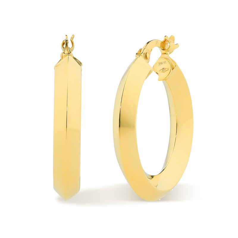 9ct yellow gold round polished hoop earrings with a knife edge profile and hinged, click in posts. Weight: 2.04grams approximately Age: Modern