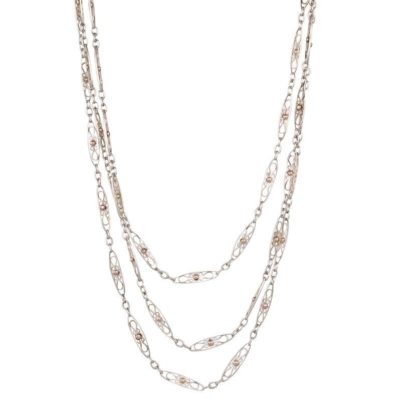 Fancy link silver guard chain comprised of lozenge shaped links with fine wire work and rose gold topped silver circular details, fastening with a swivel clasp.