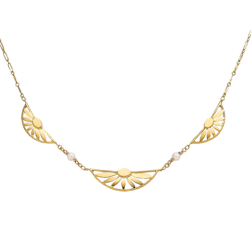 Antique French necklace comprised of three decorative crescent moon shaped floral panels, each separated by a small pearl, featuring a 1:1 figaro chain, finished with a bolt ring clasp, and French eagle head hallmark for 18ct gold.