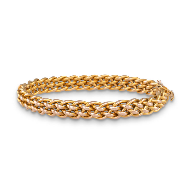9ct yellow and rose gold hinged bangle in a plaited design, fastening with a push tongue clasp and safety chain. Weight: 16.61grams Age: C1900