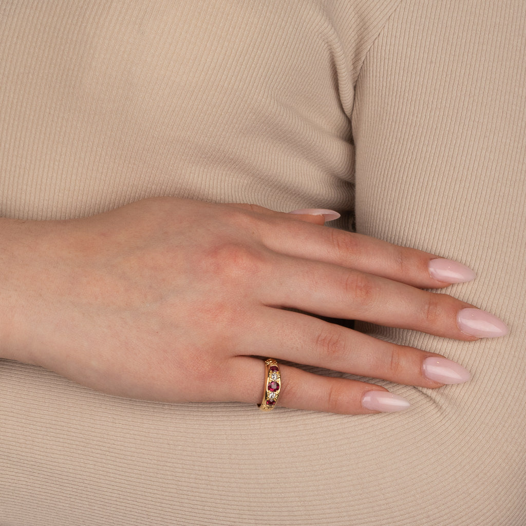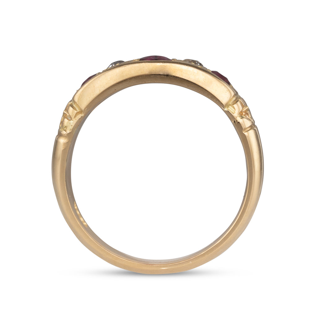 18ct yellow gold ring grain set across the top panel with two oval and a cushion cut ruby and separating them two old cut diamonds, to engraved shoulders and tapering band.