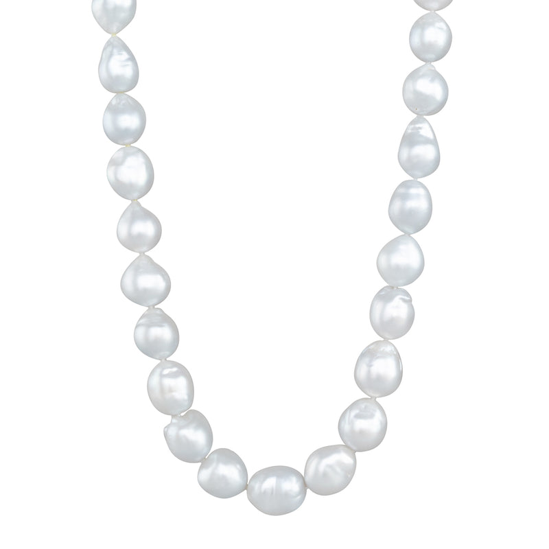A strand of baroque silver white South Sea pearls measuring 13.1 - 15mm with a good lustre and some natural baroque surface marks and shapes. 27 pearls threaded to 18ct white gold 12mm matte ball clasp.