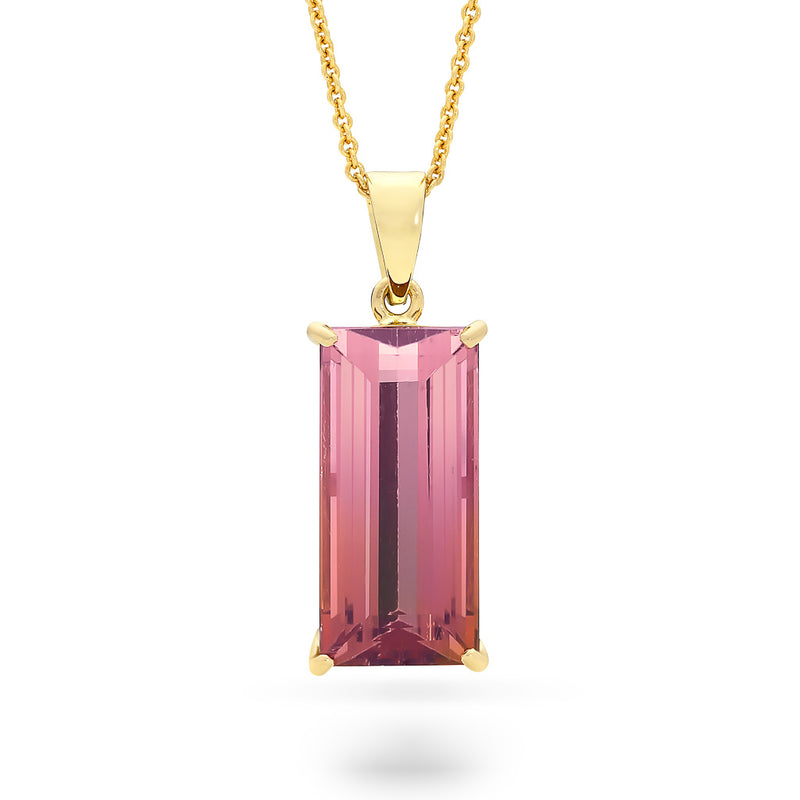 18ct yellow gold pendant four claw set set with a baguette cut light peach to dark red-pink tourmaline on pierced gallery, below an articulated polished bail.