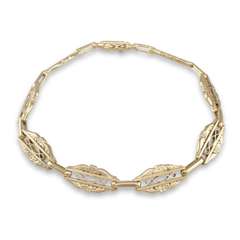 A 14 yellow gold fancy link bracelet, featuring a floral motif on each link, finished with a concealed closure and a figure eight safetly latch.