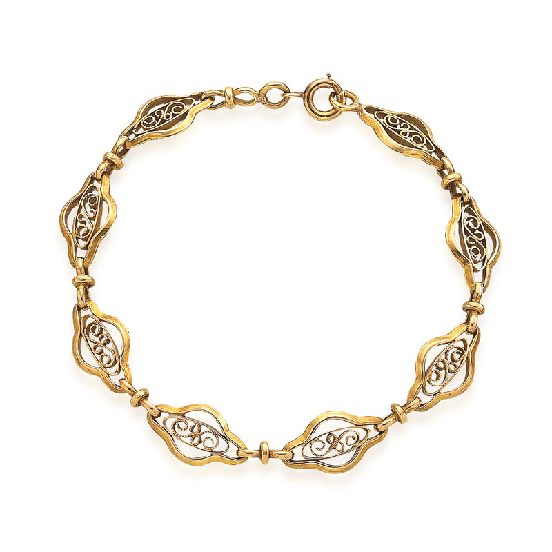 18ct yellow gold bracelet made as a series of links with filigree centres fastening with a bolt ring clasp.