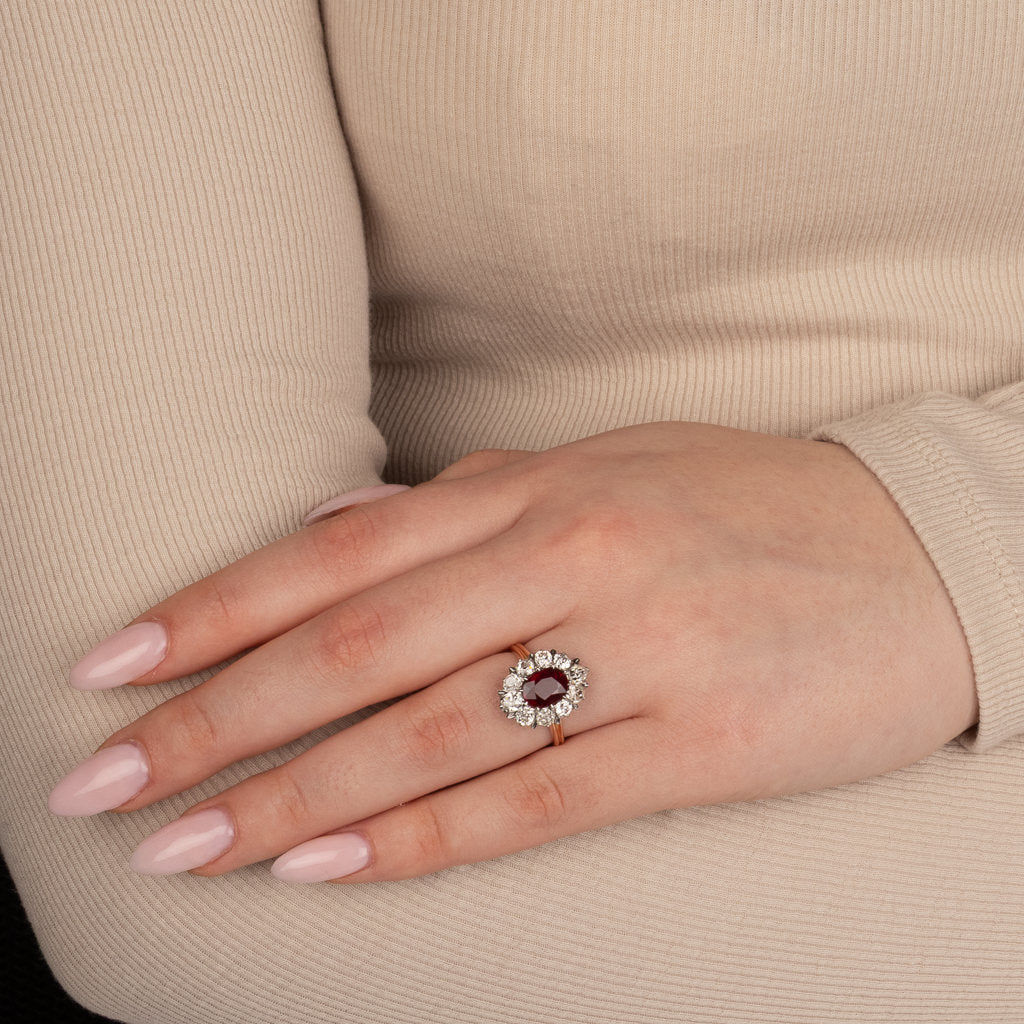 18ct two tone gold cluster ring, featuring an oval ruby of estimated weight 1.89ct surrounded by a border of eight old cut diamonds, and to the upper and lower edges an old pear cut diamond, in white gold claw settings, to a grooved polished rose gold band.