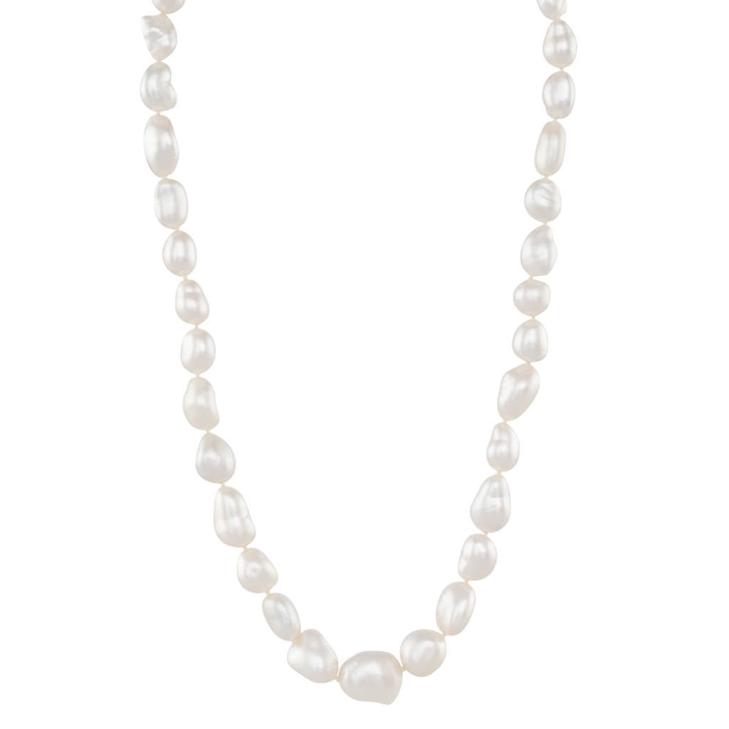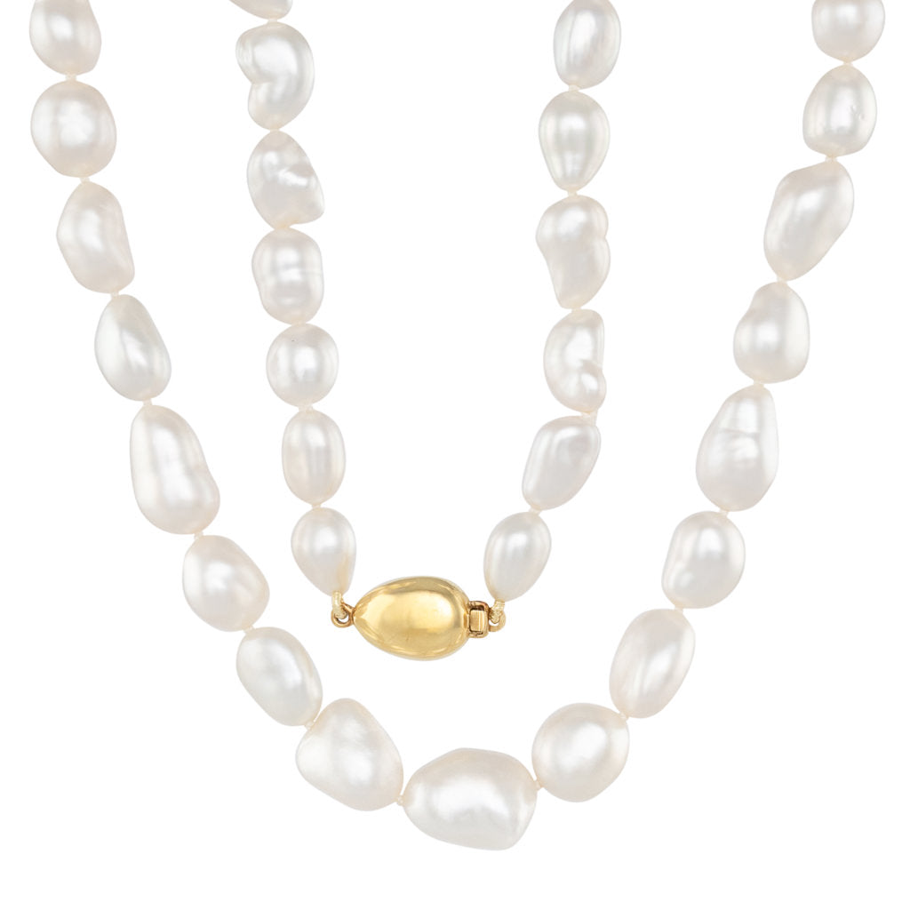 A strand of white South Sea Keshi pearls measuring approximately 10 - 13mm with a bright lustre, smooth shapes and few natural surface marks. 35 pearls threaded to a 9ct yellow gold barrel clasp.