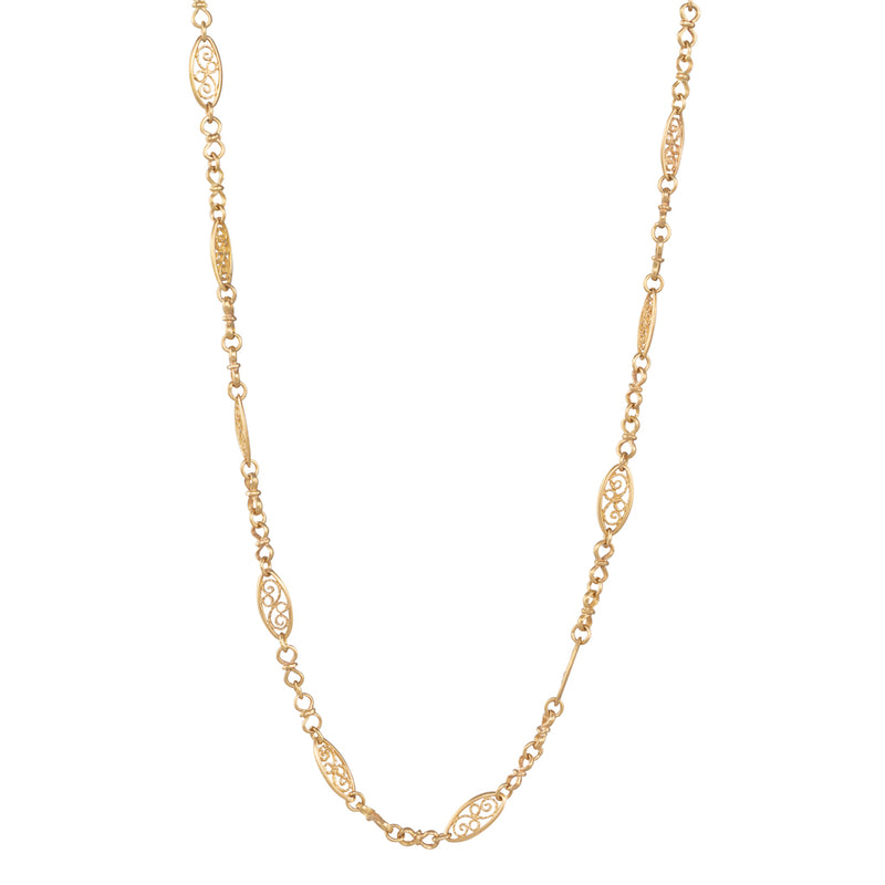 A 18ct yellow gold French chain, with decorative links featuring delicate wire work and finished with a bolt clasp