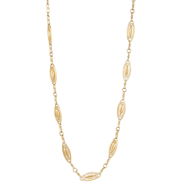 An 18ct yellow gold fancy link chain featuring navette shaped links with wire work connected by figure eight links, finished with an 18ct gold swivel clasp.