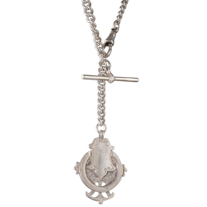 Sterling silver Albert fob chain with solid curb links, graduating in size, fitted with a T-bar and an elaborate multi layered medal, and for fastening, a swivel clasp.