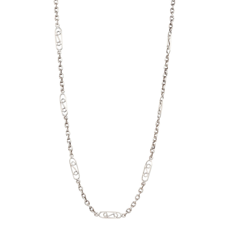 Antique silver chain with oval filigree links at regular intervals, separated by lengths of plain chain, fastening with a T-bar and ring enabling the chain to be worn lariat style.