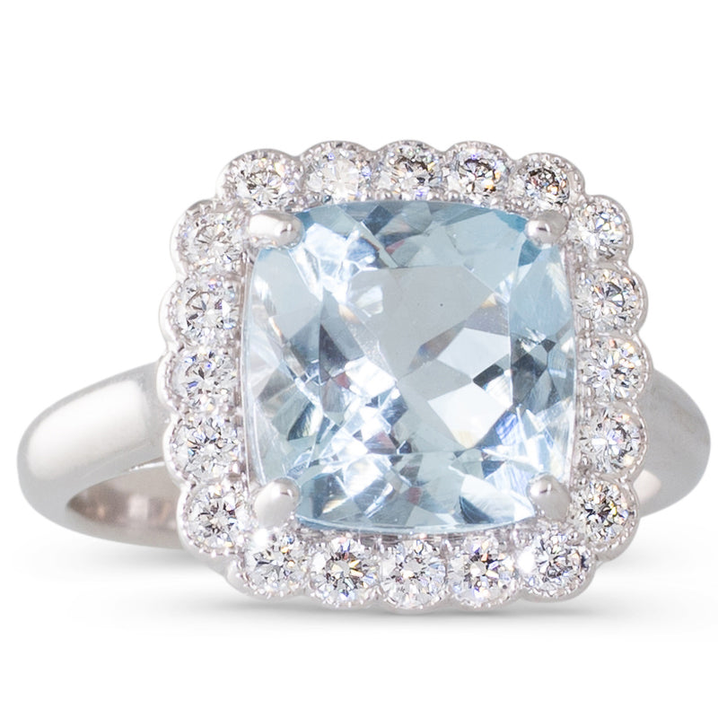 18ct white gold ring four claw set to the centre with a 2.84ct cushion cut aquamarine with a scalloped surround of grain set round brilliant cut diamonds with mill grain edging on a lattice pierced gallery to upswept shoulders and a plain polished band.