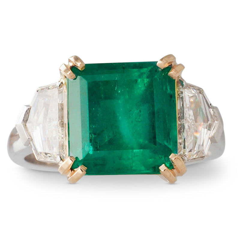 Platinum and 18ct yellow gold ring, set in four double claws to the centre with an AGL certified 3.70ct emerald cut Colombian emerald, on a double railed gallery, to either side in platinum an end set cadi cut diamond, to upswept shoulders and a polished platinum band.