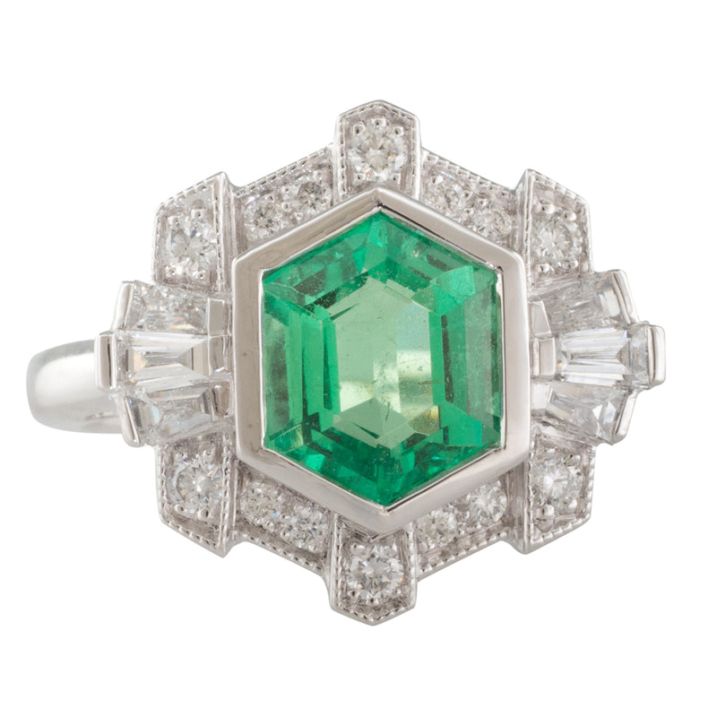 18ct white gold Art Deco style ring bezel set to the centre with a GIA certified 1.37ct Ethiopian emerald, hexagonal in shape and with no indications of clarity enhancement, with three tapered baguette cut diamonds to either shoulder and above and below the emerald a stepped and mill grained edge of grain set round brilliant cut diamonds, on a cheniered gallery, to upswept open shoulders and a plain polished band.