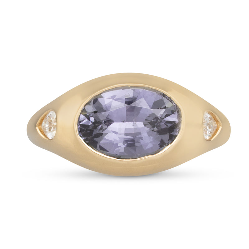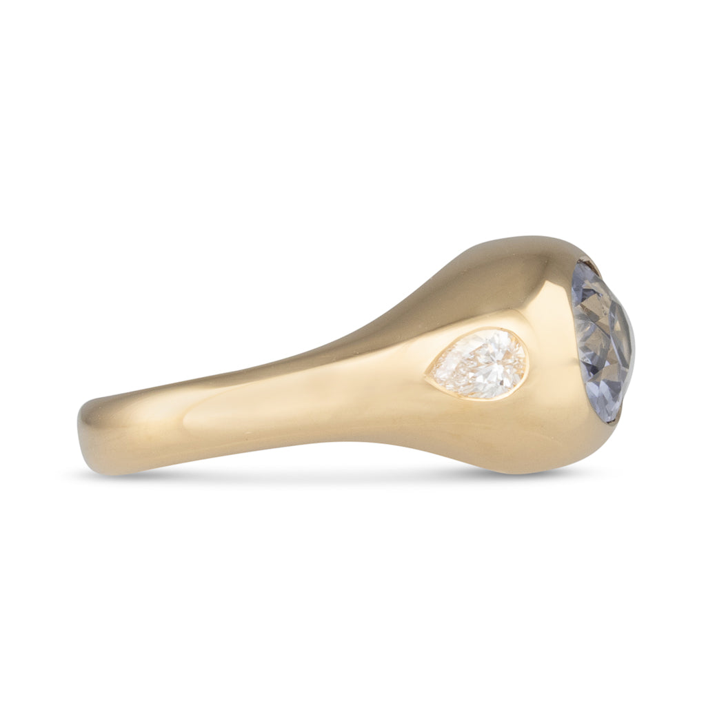 18ct yellow gold domed ring gypsy set with a 2.99ct oval grey spinel and to either side a pear cut diamond on a polished and tapering band.