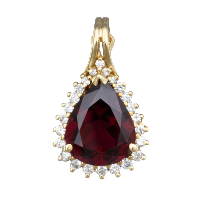 18ct yellow gold cluster style enhancer pendant claw set with a pear cut Mozambique garnet of estimated weight 6.88ct and set in shared claws to the surround with twenty four round brilliant cut diamonds.