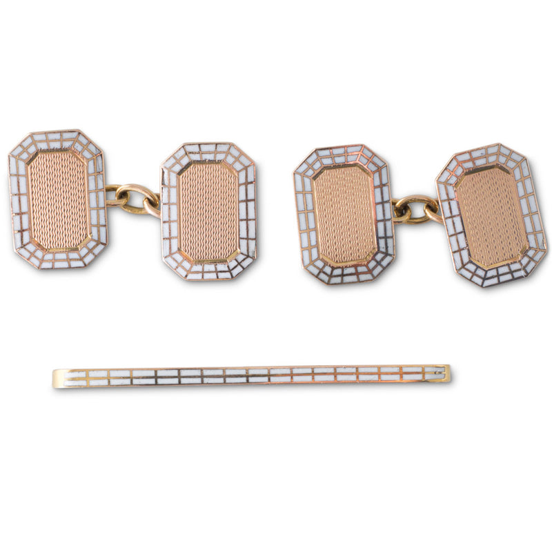 A pair of 9ct gold octagonal double cufflinks with each panel with a central engine turned pattern with a border of white enamel, hallmarked to the rear and the makers mark EAP, together with a matching tiebar all in a box retailed by James Walker Ltd ''The London Jewellers''.