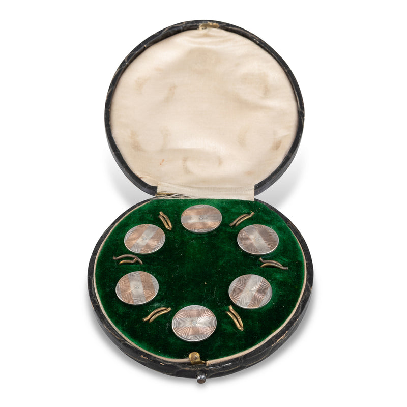 A set of six shirt studs crafted in sterling silver with a rose gold inlay and engine turned pattern. Each stud fully hallmarked and presented in the original box.