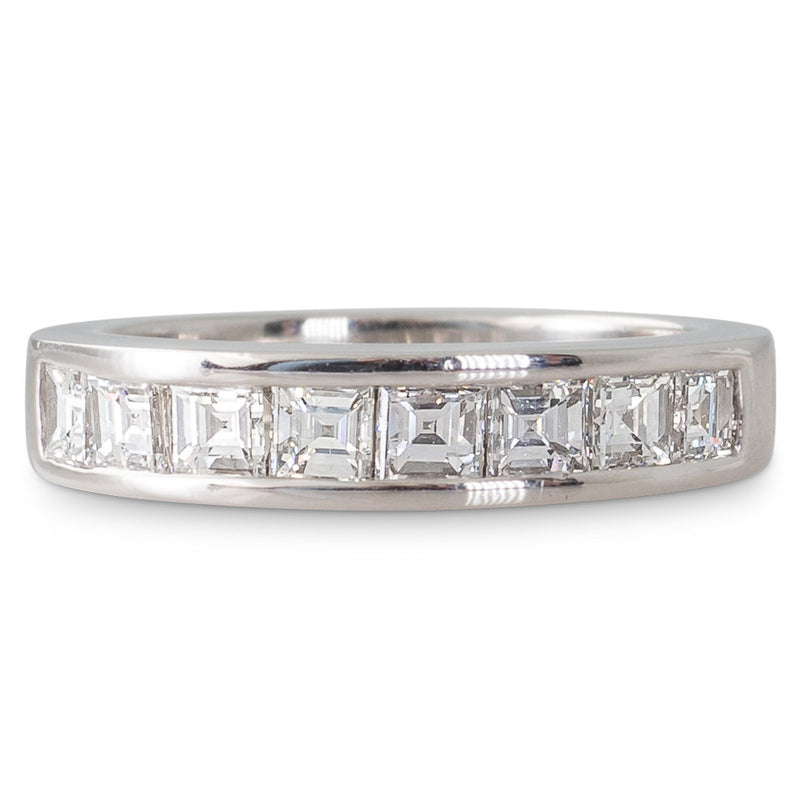 Platinum band being 4.2mm wide and channel set across the top with eight carre cut diamonds on a plain polished band tapering to 3.4m wide at the base.