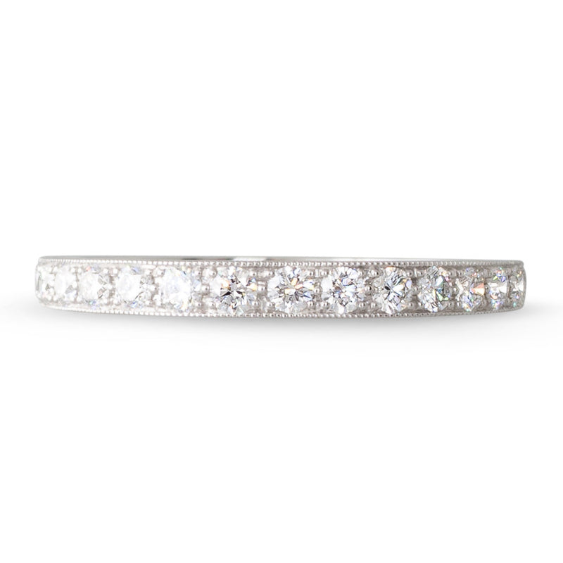 Platinum band grain set across the top with fifteen round brilliant cut diamonds, with millgrain edging and scroll engraving to both sides and lower half of band..