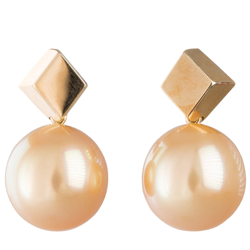 A pair of slight oval strong gold South Sea pearl stud earrings in 18ct yellow gold featuring pearls measuring 11.1mm with a bright lustre and few natural surface marks. The pearls are fixed below a soft edged gold square.
