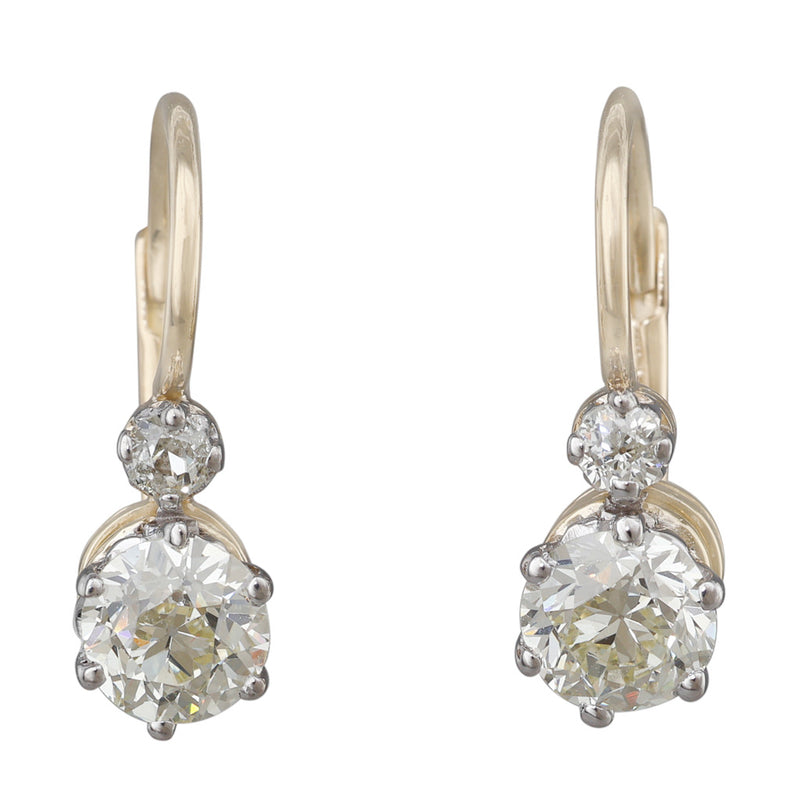 A pair of 18ct yellow and white gold diamond earrings, each set with an old cut diamond of estimated weight 0.75ct, graded as colour M-N, clarity VS in a slightly articulated, six claw setting, suspended below a smaller diamond in a four claw setting, on continental hook fittings.