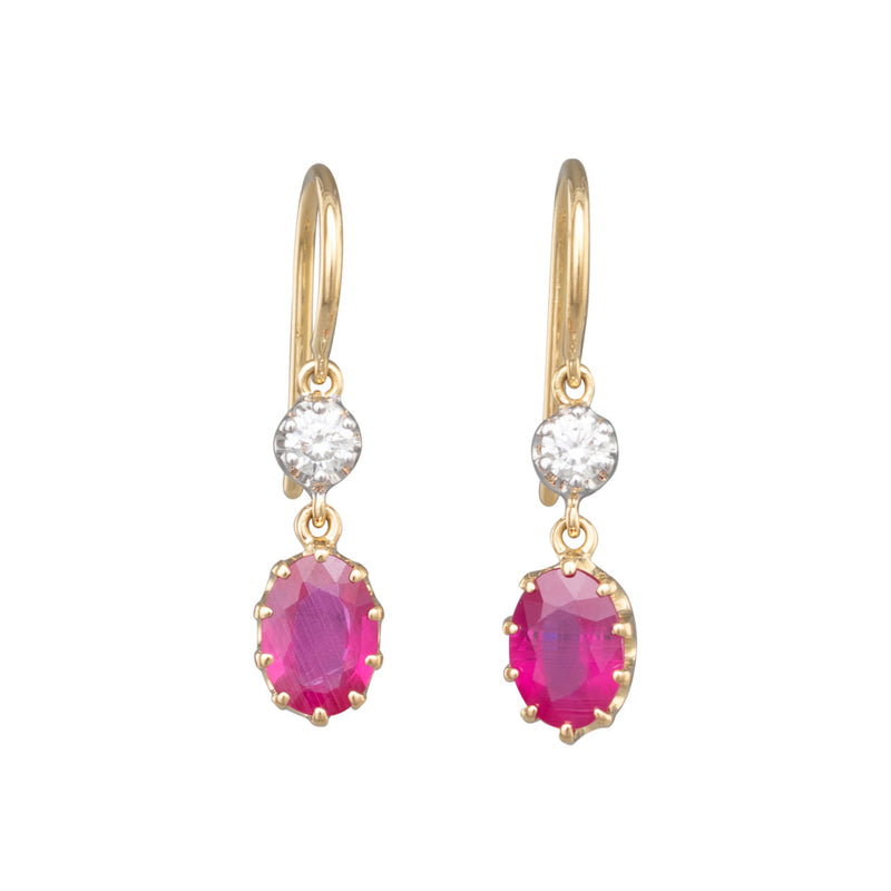 18ct yellow and white gold pair of drop earrings, each with a Bellerophon Gemlab certified oval Mozambique ruby (one unheated), ten claw set, articulated below a round brilliant cut diamond, with articulated shepherd's hooks.